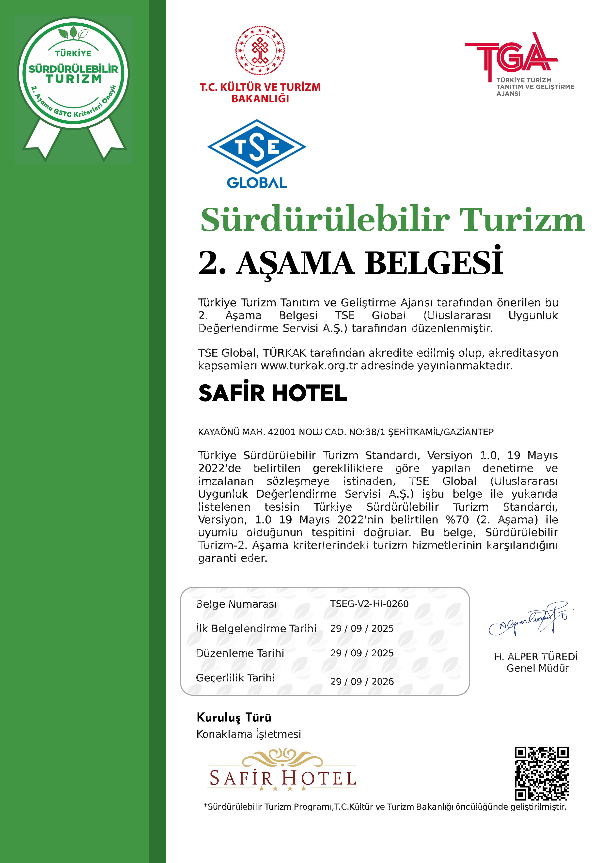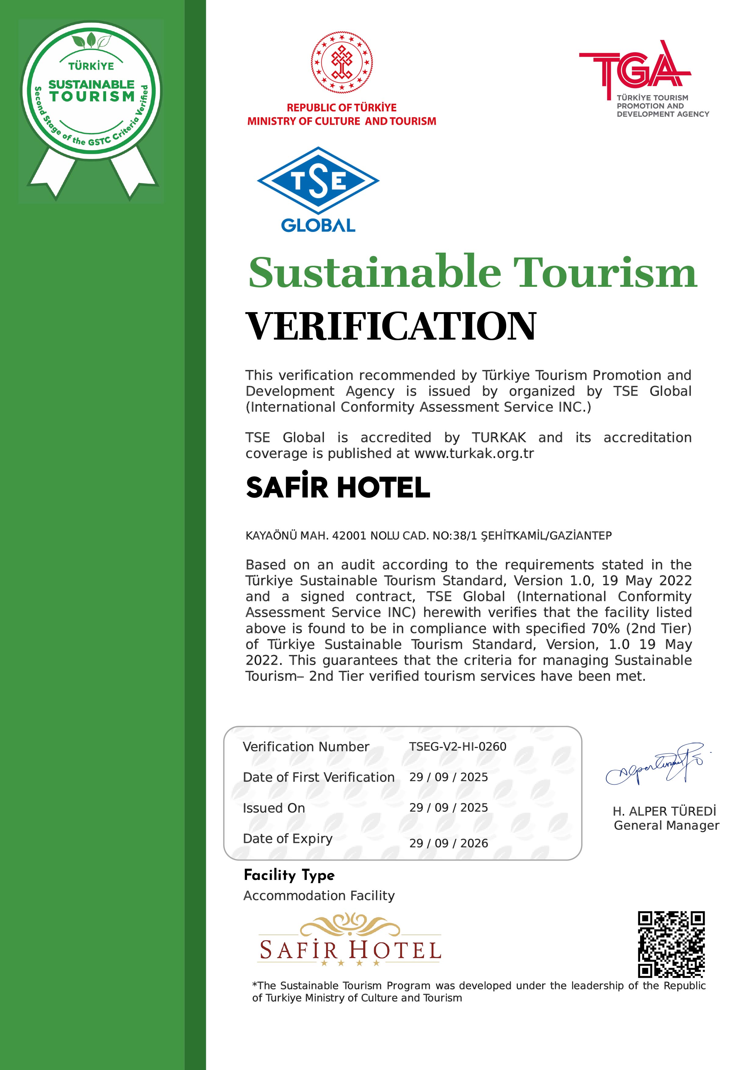 Safir Hotel olarak, sadece bugünün değil geleceğin de ihtiyaçlarını gözeten bir anlayışı benimsiyoruz. Doğal kaynakların korunması ve çevreye duyarlı hizmet anlayışımızla, sürdürülebilir bir turizm modeli oluşturmayı sorumluluğumuz olarak kabul ediyoruz.
